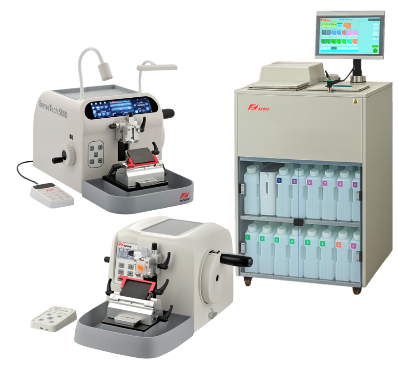Micrótomo semiautomático con pantalla touch, diseño totalmente renovado. Opciones de escanear códigos de cassetes, panel de control touch y panel tipo keypad.